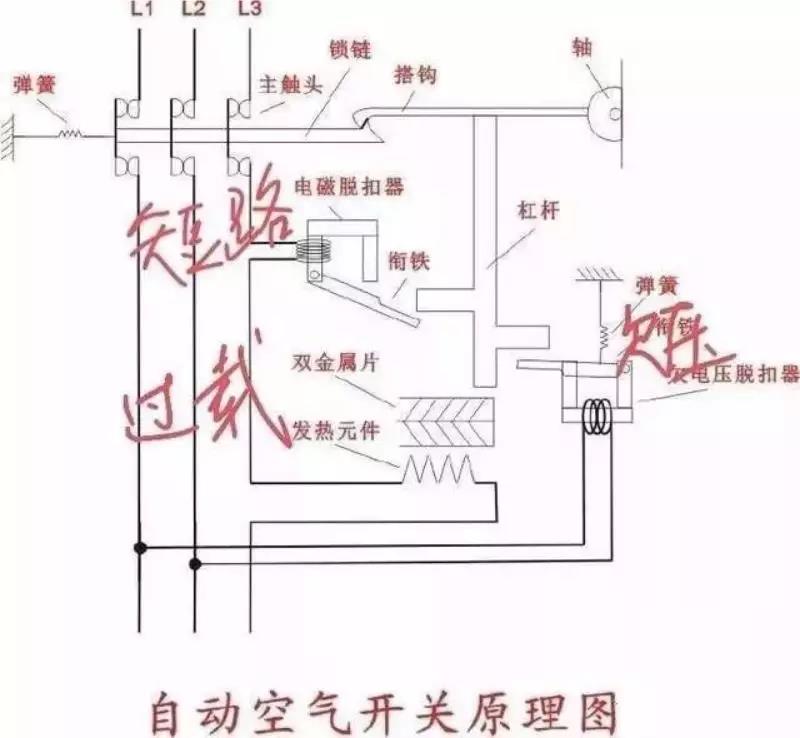 空氣開(kāi)關(guān)的原理:空氣開(kāi)關(guān)入線和出線間串了個(gè)十幾到二十圈的電感,電流足夠時(shí)吸合帶動(dòng)機(jī)械杠桿動(dòng)作保護(hù)。
