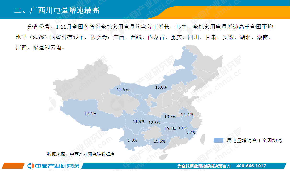 2018年11月全國全社會用電量5647億千瓦時,同比增長6 3%。1-11月全國全社會用電量62199億千瓦時,同比增長8 5%,增速比上年同期提高2 0個百分點。