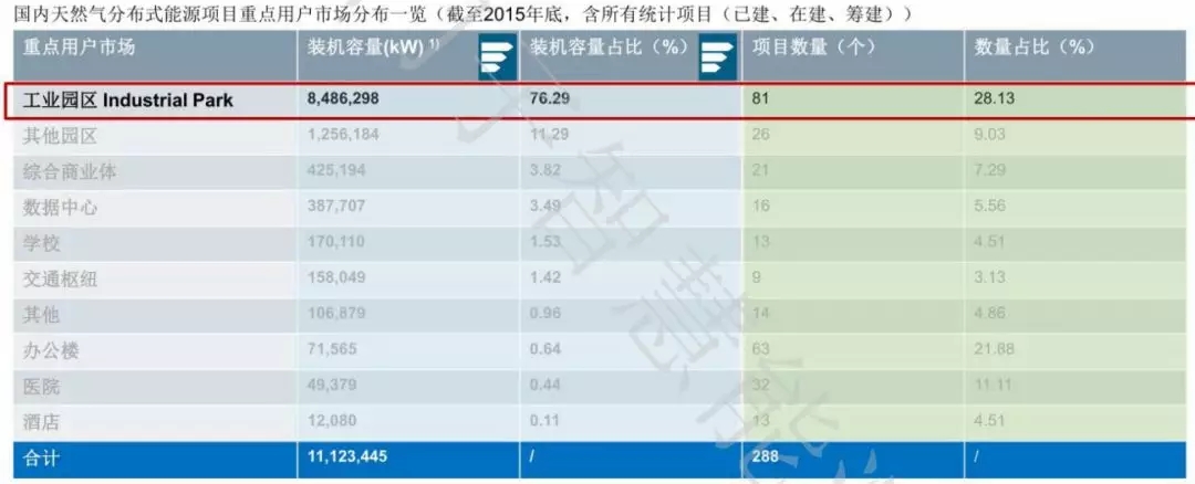 以燃?xì)夥植际侥茉错椖繛槔?,在工業(yè)園區(qū)、商業(yè)綜合體、數(shù)據(jù)中心、學(xué)校等市場中,工業(yè)園區(qū)中分布式能源項目的裝機(jī)容量、項目數(shù)量占比都是最大的。