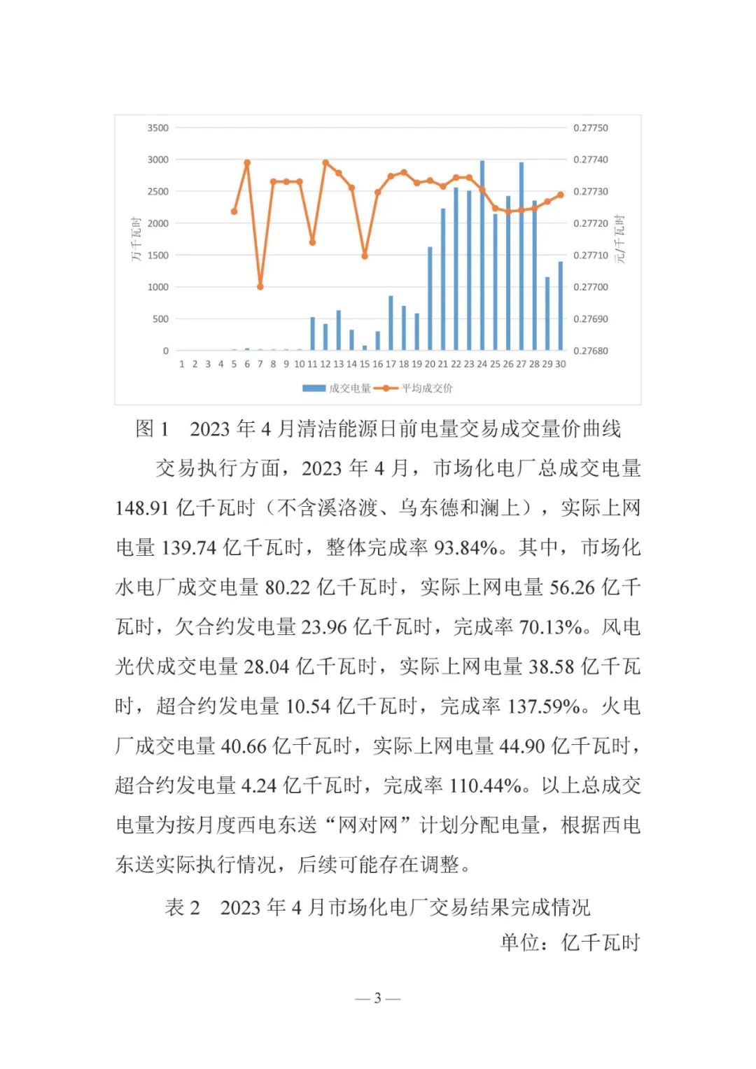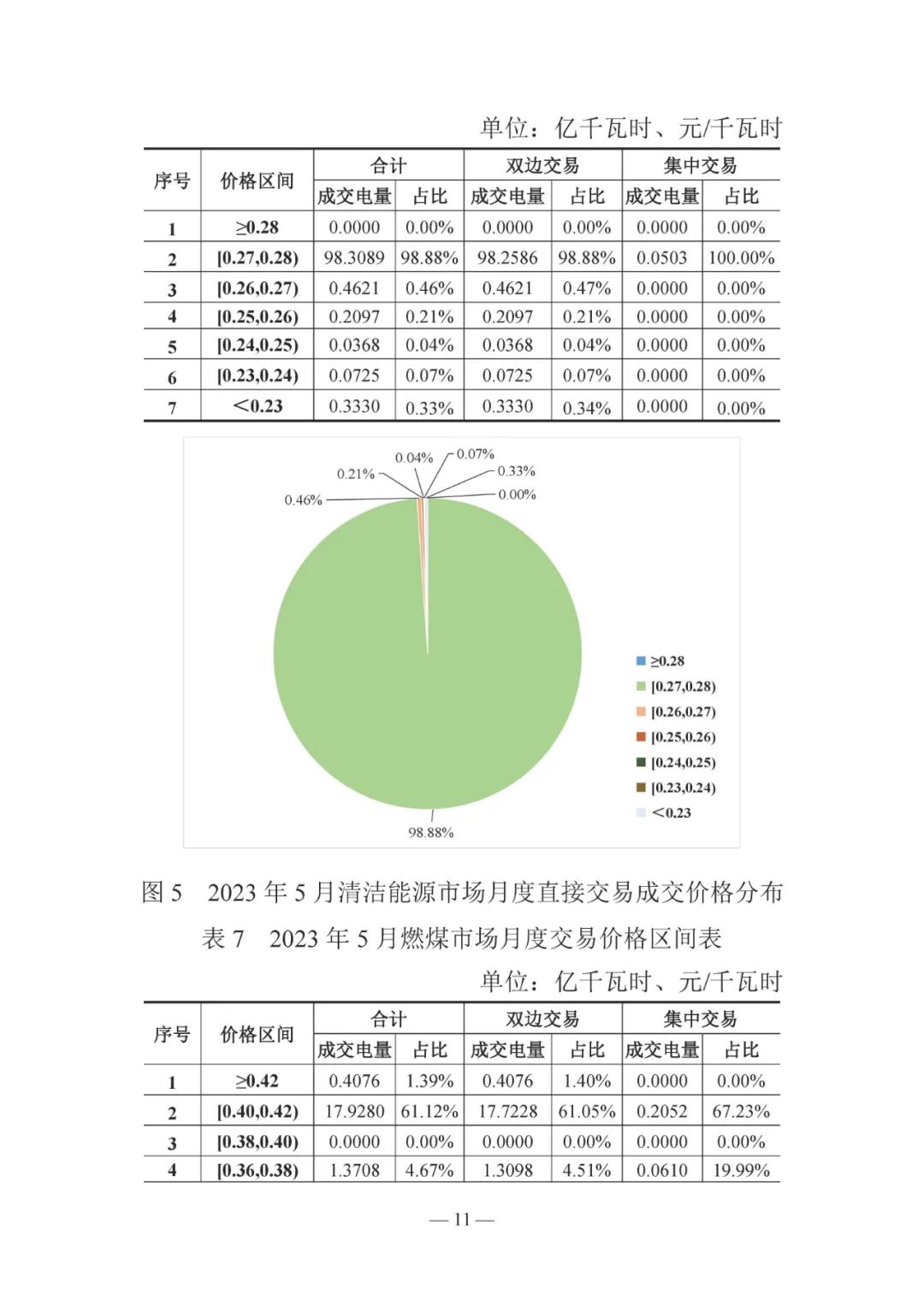2023年5月,云南省內(nèi)市場(chǎng)化交易電量 139 81億千瓦時(shí),同比減少 10 97%。其中省內(nèi)清潔能源直接交易電量99 42億千瓦時(shí),平均成交價(jià)0 27487