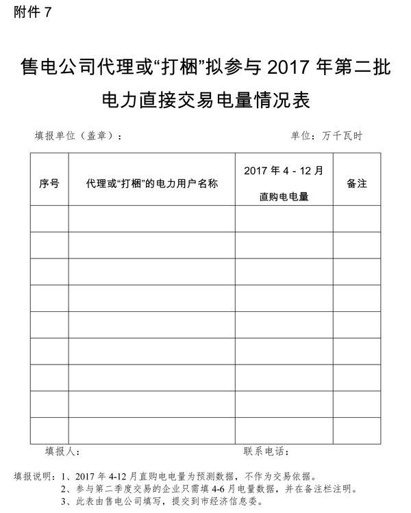 2.售電公司代理或“打捆”參與2017年第二批電力直接交易電量情況表(附件7)。