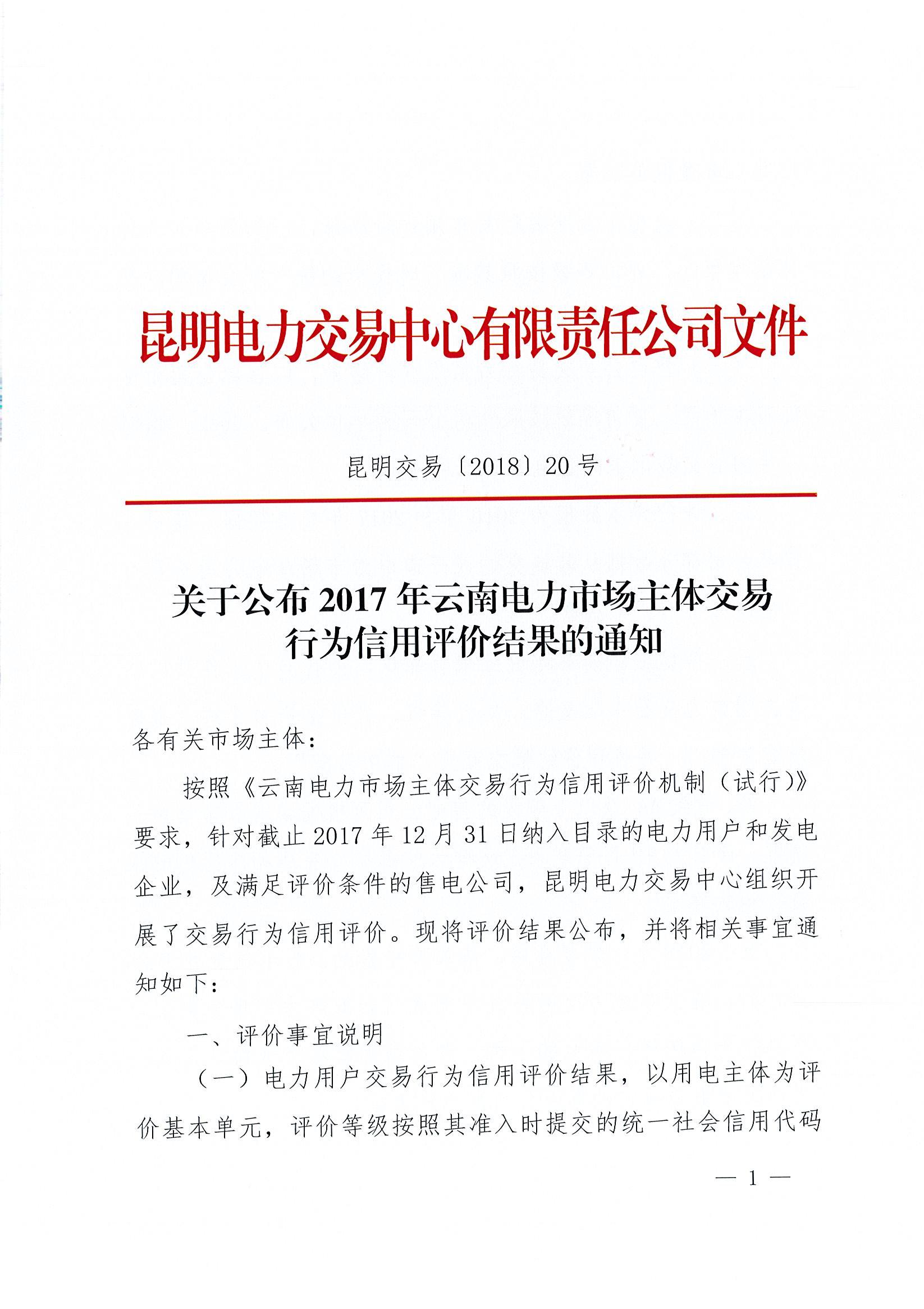 昆明電力交易中心日前公布了《2017年云南電力市場(chǎng)主體交易行為信用評(píng)價(jià)結(jié)果》,針對(duì)截止2017年12月31日納入目錄的電力用戶和發(fā)電企業(yè),及滿