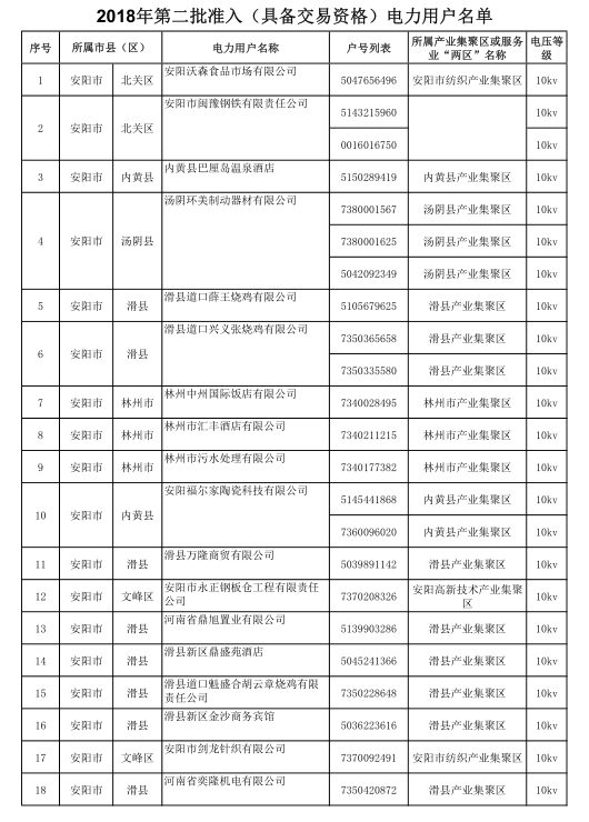 河南2018年第二批準(zhǔn)入524家電力用戶名單