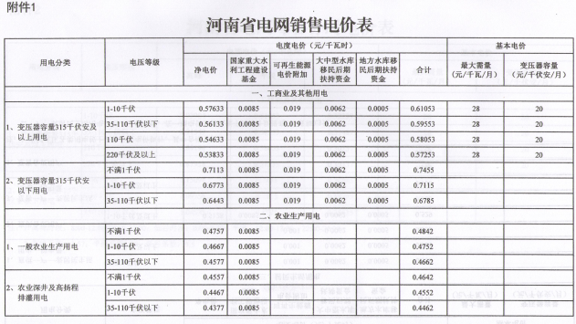 附件:1.河南省電網(wǎng)銷售電價(jià)表