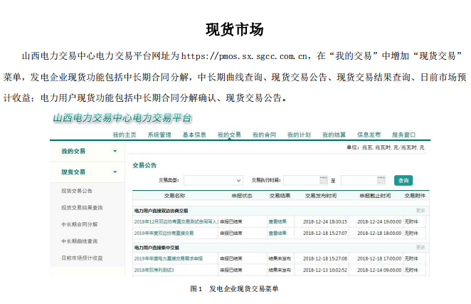 另外印發(fā)了現(xiàn)貨申報(bào)操作手冊(cè):發(fā)電企業(yè)現(xiàn)貨功能包括中長(zhǎng)期合同分解,中長(zhǎng)期曲線查詢、現(xiàn)貨交易公告、現(xiàn)貨交易結(jié)果查詢、日前市場(chǎng)預(yù)計(jì)收益;電力用戶現(xiàn)貨功能包括中長(zhǎng)期合同分解確認(rèn)、現(xiàn)貨交易公告。