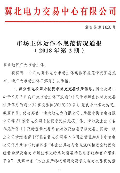 冀北電力交易中心日前發(fā)布了《市場(chǎng)主體運(yùn)作不規(guī)范情況通報(bào)(2018年第2期)》,其中含21家售電公司未按要求補(bǔ)充完善注冊(cè)信息、19家售電公司購(gòu)