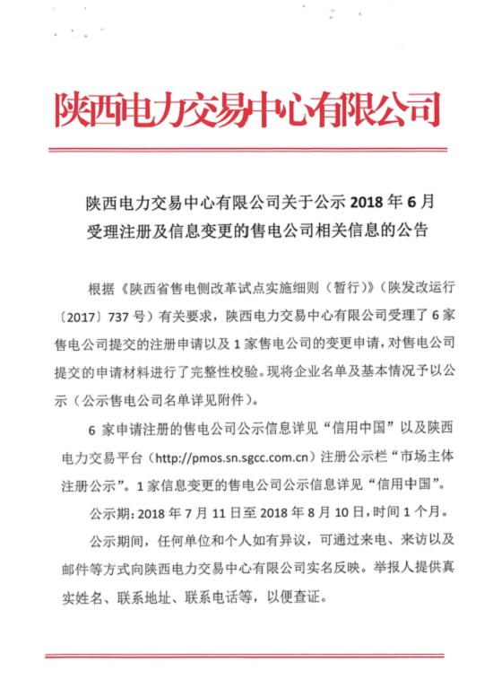 陜西公示6家售電公司以及1家申請變更注冊信息的售電公司