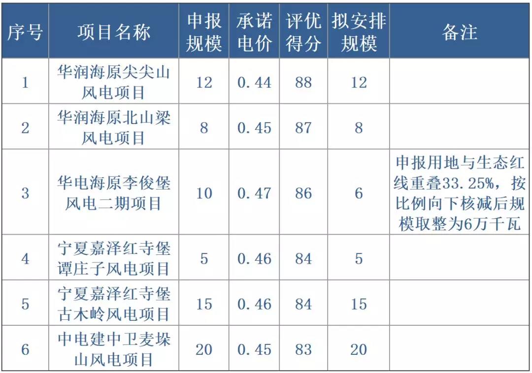 根據(jù)寧夏風電基地2018年度風電項目競爭配置評優(yōu)結(jié)果,獲得風電指標的項目中,華潤海原、華電海原、寧夏嘉澤新能源、中國電建所屬的六個項目評分在80分以上,華潤海原尖尖山風電項目得分最高為88分,申報電價0.44元/千瓦時;最低項目得分為靈武市輝源景旭風電項目,得分為34分。