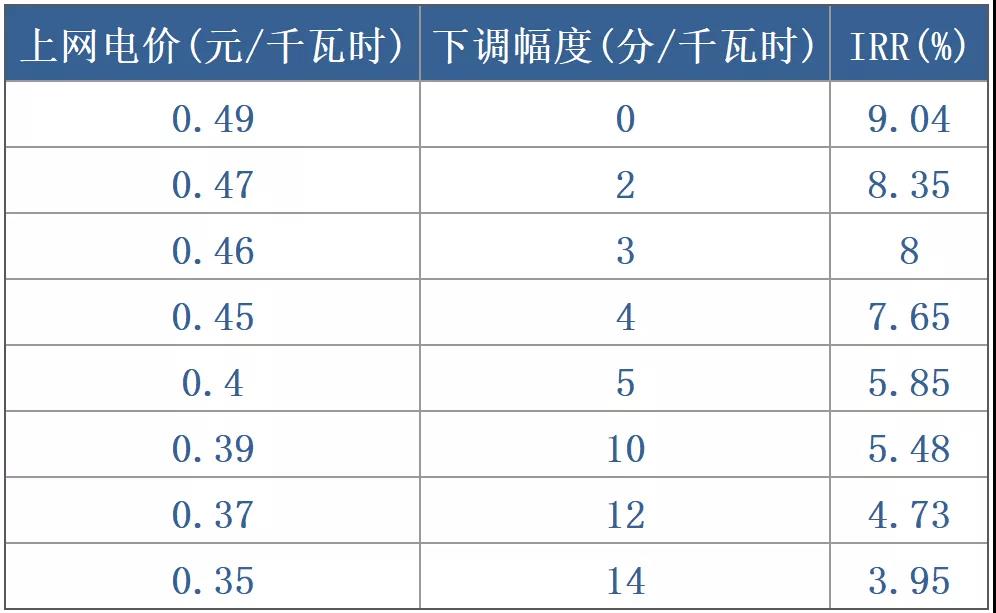 圖表:上網(wǎng)電價下調(diào)與項目IRR測算