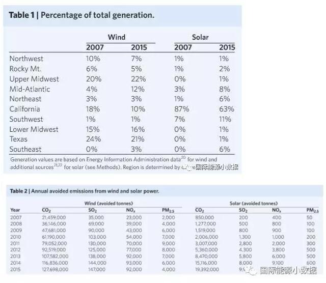 在光伏、風(fēng)電的發(fā)展過(guò)程中,大多數(shù)人都在關(guān)注其成本的下降,特別是何時(shí)實(shí)現(xiàn)平價(jià)上網(wǎng),但是對(duì)于光伏、風(fēng)電的公共效益往往只是定性描述。針對(duì)這個(gè)問(wèn)題,美國(guó)勞倫斯伯克利國(guó)家實(shí)驗(yàn)室研究人員在最新一期《自然˙能源》發(fā)表文章,對(duì)因?yàn)轱L(fēng)電、光伏帶來(lái)的空氣改善所帶來(lái)的公共收益進(jìn)行了量化計(jì)算,具體計(jì)算過(guò)程和結(jié)果可參見(jiàn)以下三個(gè)表格(美國(guó)各地區(qū)光伏風(fēng)電比例、污染物減排數(shù)字、因減排帶來(lái)的經(jīng)濟(jì)收益)。