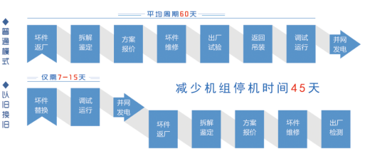 “以舊換舊”模式優(yōu)勢明顯,首先可避免吊車二次進場,降低維修成本;最重要的是可以將機組停機時間從60天縮減到7-15天。以1500千瓦機組齒輪箱維修為例,可減少發(fā)電量損失20萬元左右。