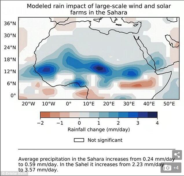覆蓋廣闊地區(qū)的裝置可以滿(mǎn)足歐洲、中東和非洲的能源需求,以及增加降雨量,最終促進(jìn)植物生長(zhǎng)。