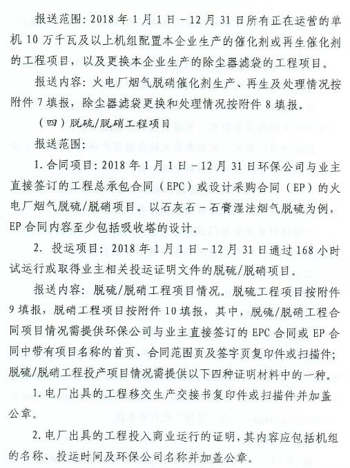 報送范圍:2018年1月1日-12月31日所有正在運營的單機10萬千瓦及以上機組配置本企業(yè)生產(chǎn)的催化劑或再生催化劑的工程項目,以及更換本企業(yè)生產(chǎn)的除塵器濾袋的工程項目。