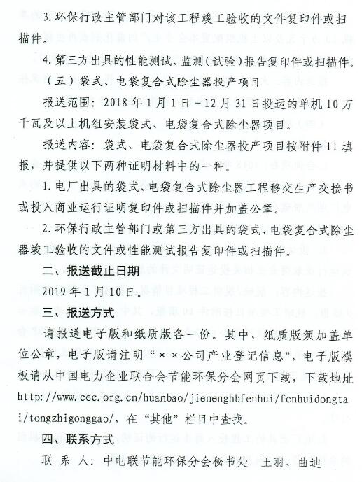 報送范圍:2018年1月1日-12月31日投運的單機10萬千瓦及以上機組安裝袋式、電袋復合式除塵器項目。