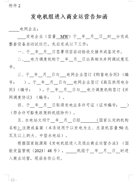 第十一條 在完成整套設(shè)備啟動試運(yùn)行后3個月內(nèi)(風(fēng)電、光伏發(fā)電項(xiàng)目在并網(wǎng)后6個月內(nèi)),擁有發(fā)電機(jī)組、獨(dú)立新型儲能的市場主體分別具備第八條、第九條商業(yè)運(yùn)營條件后,以正式文件將進(jìn)入商業(yè)運(yùn)營情況(附件2格式)及相關(guān)材料報(bào)送電網(wǎng)企業(yè),從完成整套設(shè)備啟動試運(yùn)行時間點(diǎn)起自動進(jìn)入商業(yè)運(yùn)營。