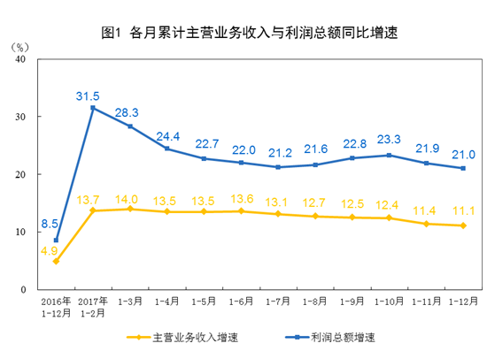 2017年12月份,規(guī)模以上工業(yè)企業(yè)實(shí)現(xiàn)利潤(rùn)總額8241.6億元,同比增長(zhǎng)10.8%,增速比11月份放緩4.1個(gè)百分點(diǎn)。