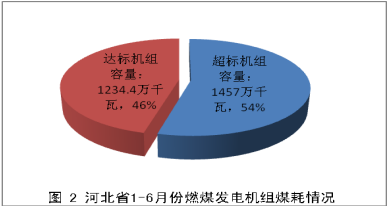 河北省共調(diào)研78臺機組,裝機容量2691.4萬千瓦,其中低于310克/千瓦時裝機容量1234.4萬千瓦,占總容量的46%,高于310克/千瓦時裝機容量1457萬千瓦,占總容量的54%(圖2)。1-6月份機組平均煤耗約為316.53克/千瓦時。