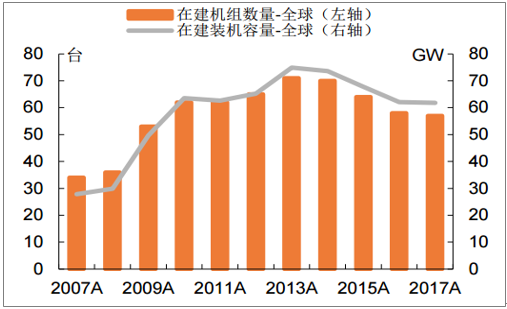 全球核電在建機(jī)組數(shù)量及裝機(jī)容量