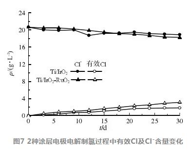 電解實(shí)驗(yàn)在電流密度為100mA/cm2、平均水溫 為27.8 °C條件下進(jìn)行,2種涂層電極電解制氯過程 中有效Cl及Cl-含量變化如圖7所示。