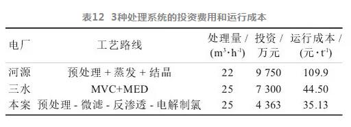 河源某電廠是國內(nèi)第1家真正意義上實(shí)現(xiàn)廢水零排放的電廠,采用了 “預(yù)處理+蒸發(fā)+結(jié)晶”工 藝,三水某電廠采用“預(yù)處理+臥式MVC濃縮+臥式MED結(jié)晶”工藝,他們與本研宄的“預(yù)處理-微濾-反滲透-電解制氯”投資及運(yùn)行成本的比較見表12。