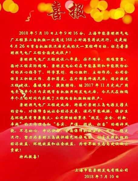 5月10日上午9時16分,上海申能崇明燃氣電廠工程第二臺機組一次通過168小時滿負荷試運行,這是繼4月26日首臺機組投運后完成的又一機組試運行