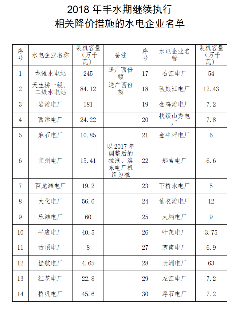 附件:2018年豐水期繼續(xù)執(zhí)行相關(guān)降價(jià)措施的水電企業(yè)名單