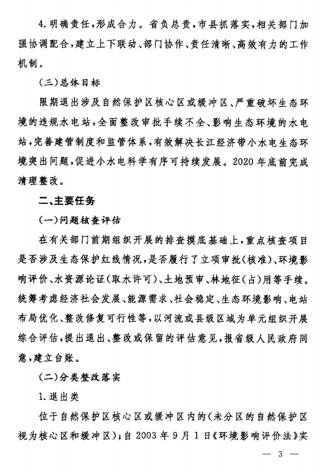 總體目標:限期退出涉及自然保護區(qū)核心區(qū)或緩沖區(qū)、嚴重破壞生態(tài)環(huán)境的違規(guī)水電站,全面整改審批手續(xù)不全、影響生態(tài)環(huán)境的水電站,完善建管制度和監(jiān)管體系,有效解決長江經(jīng)濟帶小水電生態(tài)環(huán)境突出問題,促進小水電科學有序可持續(xù)發(fā)展。2020年底前完成清理整改。