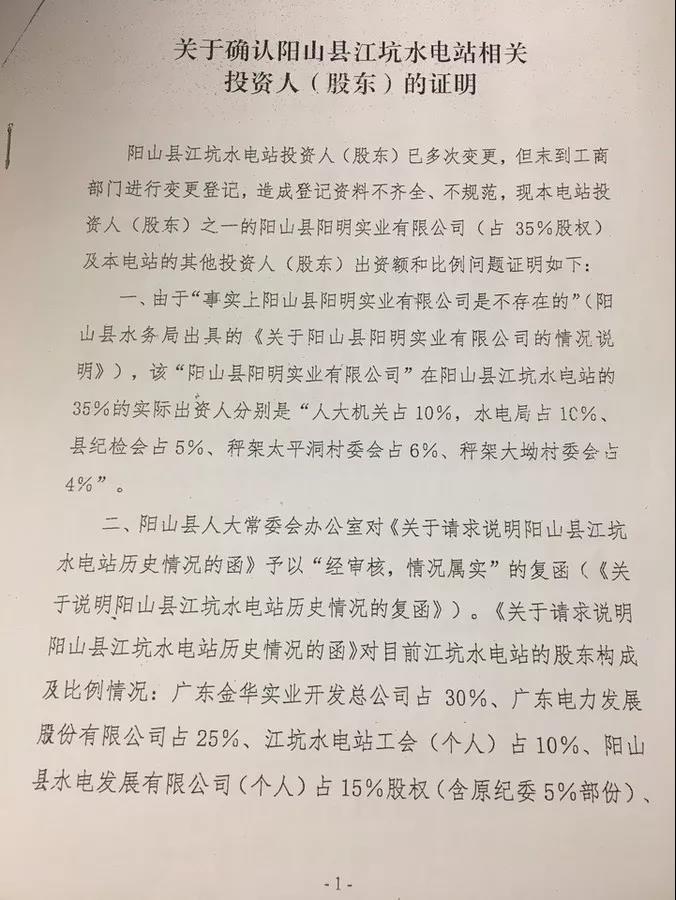 根據(jù)陽(yáng)山縣江坑水電站股東會(huì)議于1994年12月1日通過(guò)的水電站章程及銀行付款憑證,廣東金華實(shí)業(yè)開(kāi)發(fā)總公司投入江坑水電站的初始資金為600萬(wàn)元,根據(jù)陽(yáng)山縣江坑水電站董事會(huì)決議,1996年分紅擴(kuò)股85.10萬(wàn)元,2014年和2015年投入增效擴(kuò)容資金206.459158萬(wàn)元。廣東金華實(shí)業(yè)開(kāi)發(fā)總公司投資陽(yáng)山江坑水電站金額共計(jì)8,915,591.58元,股比份額30%。