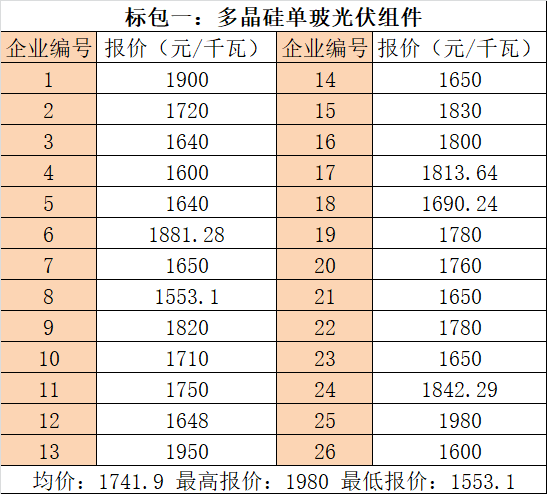 以下為此次招標(biāo)組件企業(yè)報價信息(數(shù)據(jù)來源于光伏們):