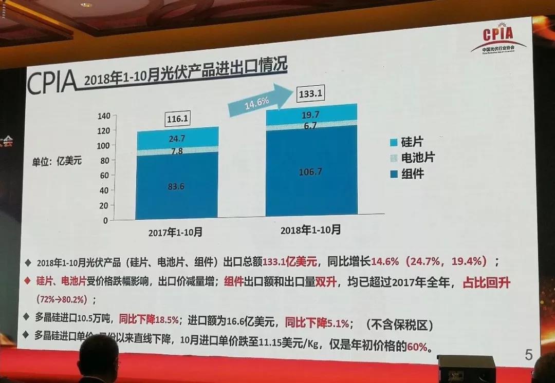 2018年1-10月光伏產(chǎn)品(硅片、電池片、組件)出口總額133.1億美元,同比 增長14.6%(24.7% 19.4%);硅片、電池片受價格跌幅影響,出口價減量增;組件出口額和出口量雙升,均已超過2017年全年,占比回升(72%→80.2%)