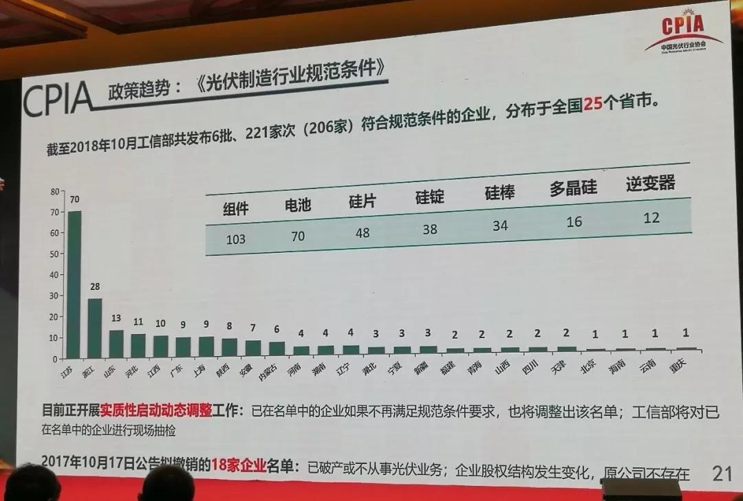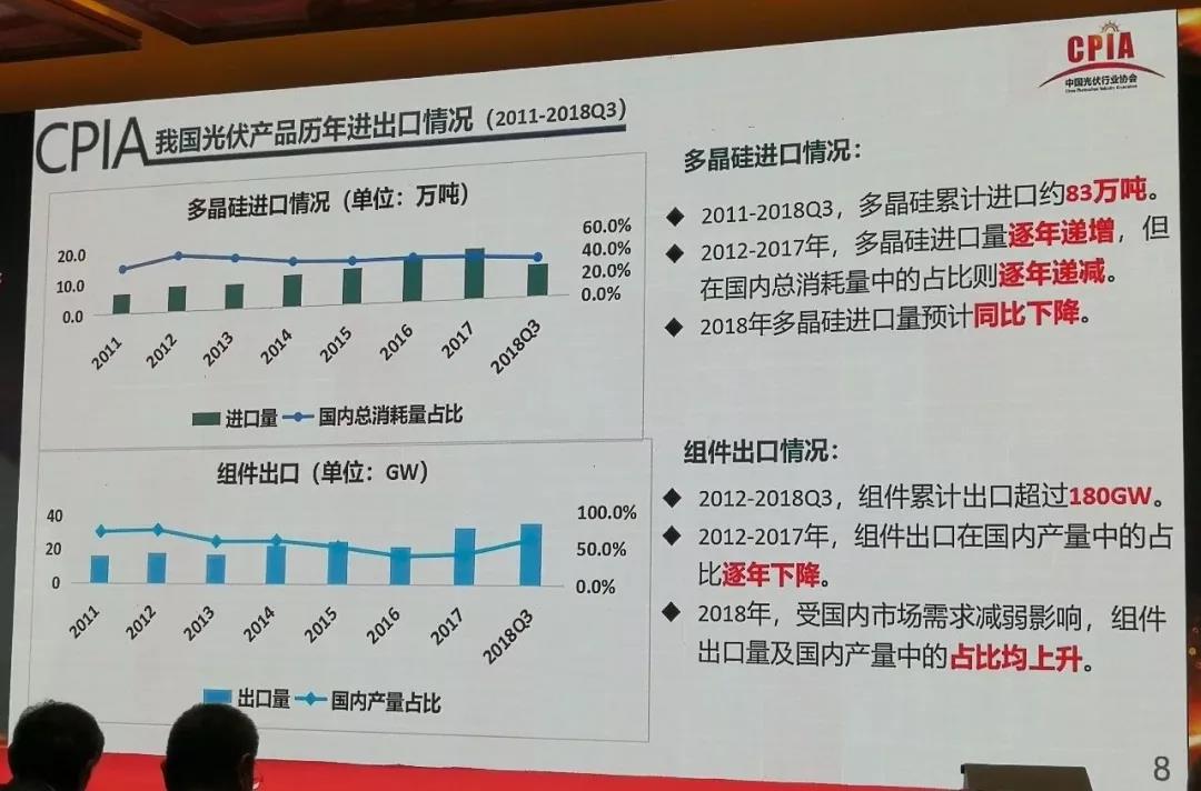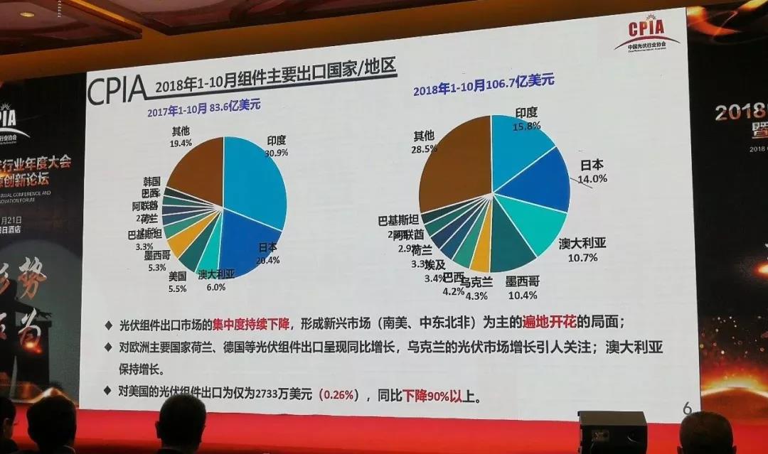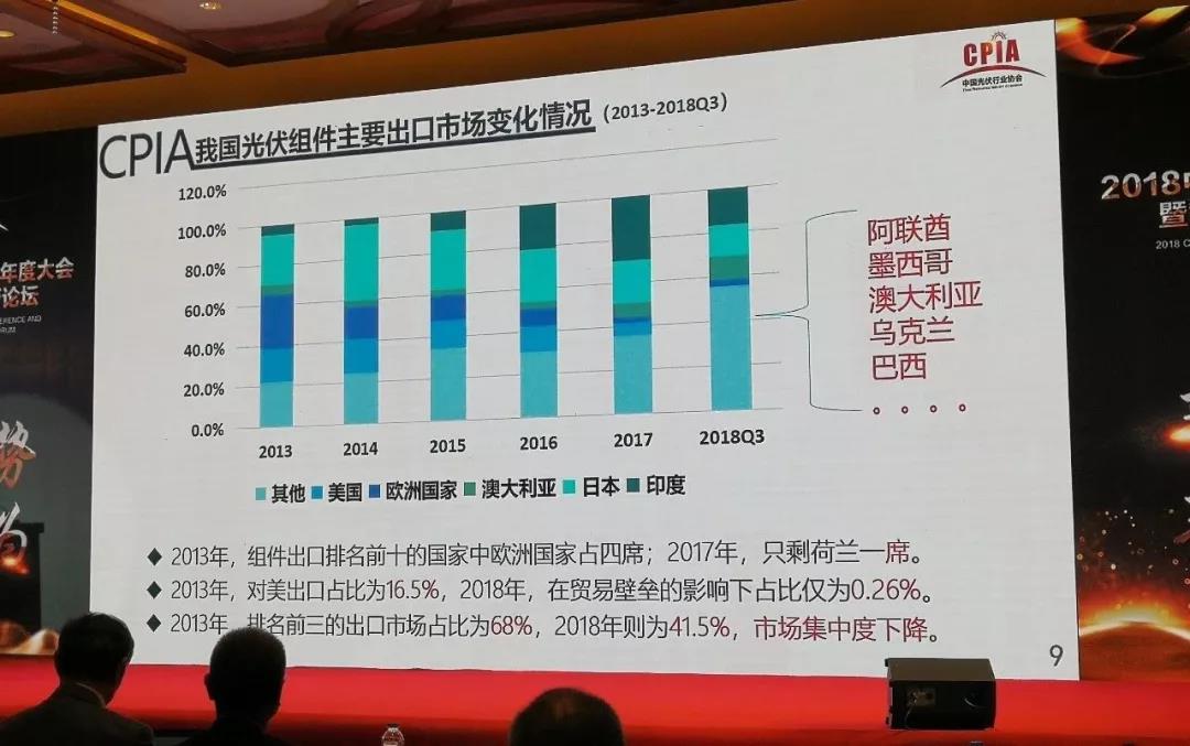 組件出口方向,集中度繼續(xù)了前幾年的趨勢,在逐漸降低。印度市場占3成,今年砍掉一半,日本也下降了10個百分點。很多新興市場也在發(fā)展當(dāng)中。