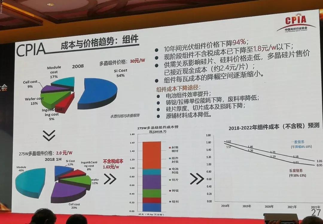 王勃華表示,產(chǎn)業(yè)發(fā)展的速度非???,2022年,組件成本可降低為1元/W。預(yù)計2022年仍會有30%左右的下降,主要表現(xiàn)在技術(shù)方面。