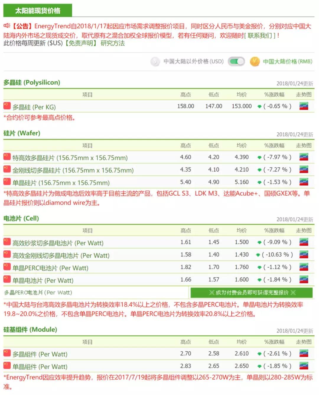 單晶電池的價格在4Q17已經(jīng)連續(xù)跌了三個月,跌至與多晶電池幾乎同價的水平,也因此進入1月后較有價格競爭力。同時,單晶電池廠家多已提前進行部分減產(chǎn)或生產(chǎn)線調整,因此受這波拋售的沖擊較低,降幅也較小。相對的,金剛線切多晶電池片的價格劇烈下跌到RMB1.4~1.5/W,下周預期還會持續(xù)影響上游的多晶硅片。