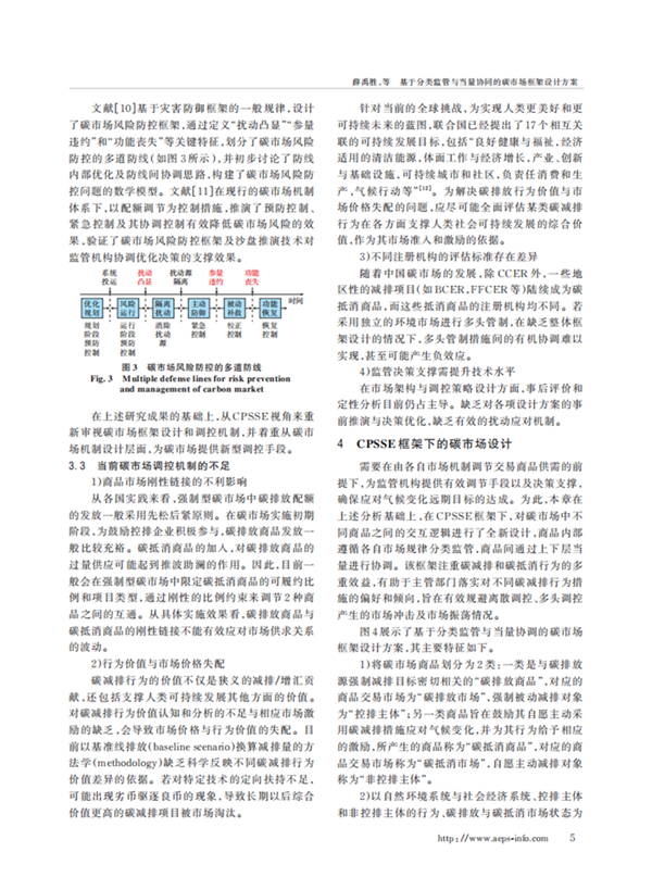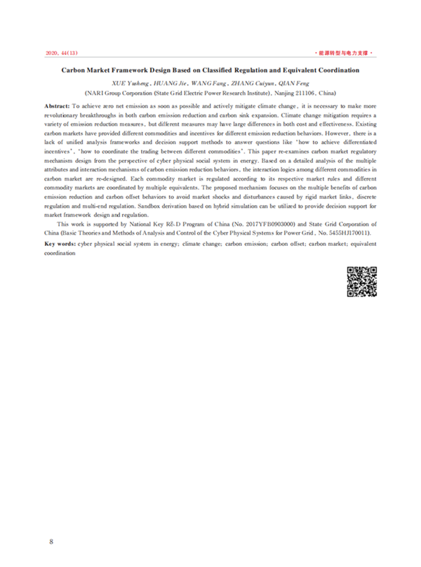摘要:為盡快實(shí)現(xiàn)凈零排放,積極應(yīng)對(duì)氣候變化,需要全球在碳源減排及碳匯增容 2 個(gè)方面取得更具變革性的突破。應(yīng)對(duì)氣候變化需要多種減排措施,其成本及效果均有較大差異,當(dāng)前碳市場(chǎng)研究已為不同減排行為提供差異化的商品種類(lèi)和激勵(lì)力度,但如何具體確定并落實(shí)差異化激勵(lì)力度以及如何協(xié)同不同商品種類(lèi)間的交易流通,目前還缺乏統(tǒng)一分析框架和決策支撐方法。在能源領(lǐng)域的信息物理社會(huì)系統(tǒng)視角下討論碳市場(chǎng)的調(diào)控機(jī)制設(shè)計(jì),在詳細(xì)剖析碳減排行為的多重屬性及其交互機(jī)理的基礎(chǔ)上,重新設(shè)計(jì)了碳市場(chǎng)不同商品間的交互框架,即商品內(nèi)部遵循各自市場(chǎng)規(guī)律分類(lèi)監(jiān)管,商品間通過(guò)多層當(dāng)量實(shí)現(xiàn)協(xié)調(diào),注重碳減排和碳抵消行為的多重效益,規(guī)避由于剛性鏈接、離散調(diào)控、多頭調(diào)控等問(wèn)題所產(chǎn)生的市場(chǎng)沖擊及市場(chǎng)振蕩。通過(guò)基于混合仿真的沙盤(pán)推演,支撐碳市場(chǎng)架構(gòu)設(shè)計(jì)及調(diào)控決策。