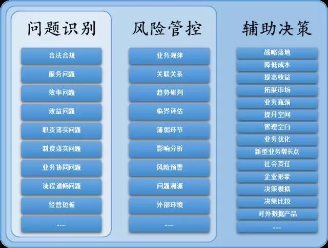在感知與預(yù)防之上,是對(duì)企業(yè)運(yùn)營(yíng)的輔助決策(主動(dòng)參謀),即對(duì)可能提升公司經(jīng)營(yíng)效果的業(yè)務(wù)空間或管理措施進(jìn)行分析和評(píng)估,為經(jīng)營(yíng)管理者提供決策參謀。與具體問(wèn)題的感知和預(yù)防相比,這一角度會(huì)在更大層面上影響企業(yè)的決策和業(yè)務(wù)變革方向。