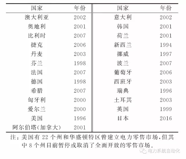 世界范圍內(nèi)的電力工業(yè)市場化改革浪潮興起于20世紀90年代,在經(jīng)歷了20余年的電力市場改革歷程后,多數(shù)發(fā)達國家已建立了開放競爭的電力零售市場,表1給出了一些國家的電力零售市場開放時間。