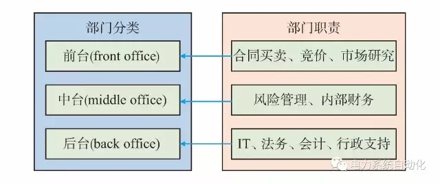 澳大利亞電力工業(yè)的市場化改革始于1998年,類似于歐洲和北美,澳大利亞的電力改革也遵循廠網(wǎng)分離、輸配分開、競價上網(wǎng)和零售自由化的思路。澳大利亞國家電力市場于1998年11月開始運作,目前有50多家零售商,其中AGL、Origin Energy和Energy Australia為三個最主要的大型零售商。其電力零售公司的交易部門總體上可分為前臺、中臺和后臺三部分,如圖1所示。