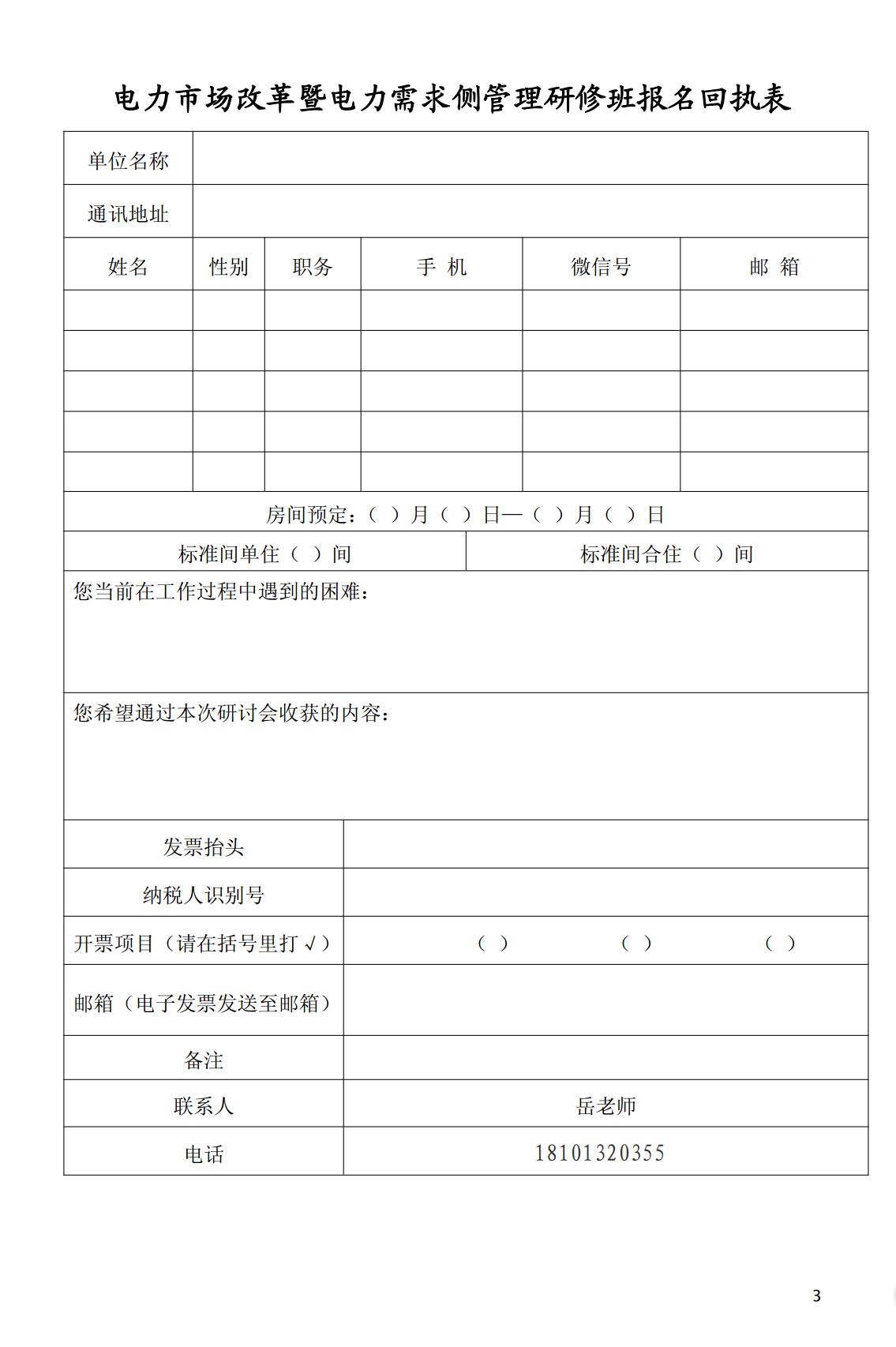 請(qǐng)有意參加的人員完整填寫(xiě)回執(zhí)表, 并及時(shí)發(fā)送傳真或電郵至?xí)?wù)組, 報(bào)名截止日期會(huì)前一周, 會(huì)務(wù)組收到報(bào)名回執(zhí)后將于開(kāi)班前 7天下發(fā)《報(bào)到通知》, 告知具體報(bào)到時(shí)間、 地點(diǎn)、 行車路線及日程安排等事項(xiàng)。