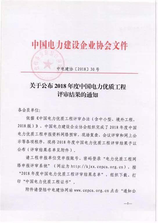近日,中國電力建設企業(yè)協(xié)會公布了2018年度中國電力優(yōu)質工程評審結果。中國電力優(yōu)質工程獎是我國電力建設行業(yè)工程質量的最高榮譽獎。中國電