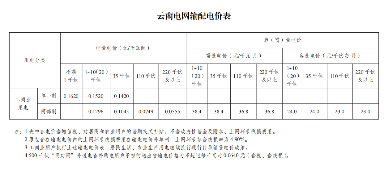 一、云南電網2023—2025年各用戶類別各電壓等級輸配電價具體標準詳見附件。