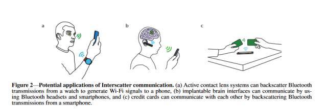 “interscatter” 技術將智能手機,智能手表等智能設備中經(jīng)常使用的藍牙,Wi-Fi 或者 ZigBee等模塊,作為信號的源或者接收端。“Interscatter” 通信的相關應用如下圖所示:(a)隱形眼鏡系統(tǒng),可以后向散射來自智能手表的藍牙信號,從而產(chǎn)生可以和手機通信的Wi-Fi信號,(b)植入大腦的接口,可以通過藍牙耳機與智能手機進行通信,(C)信用卡可以通過后向散射來自智能手機的藍牙信號,進行相互通信。