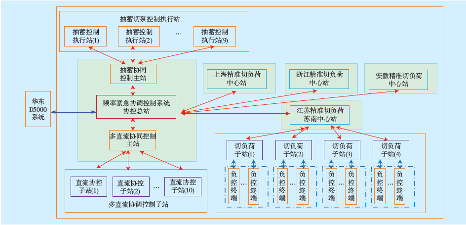 華東電網頻率緊急協(xié)調控制系統(tǒng)包括華東電網協(xié)控運行總站、多直流協(xié)調控制主站、抽蓄協(xié)調控制主站和精準負荷控制四大部分。華東電網協(xié)控運行總站、多直流協(xié)調控制主站和抽蓄切泵控制主站設置在±800 kV蘇州換流站,切負荷控制中心站設置在江蘇500 kV木瀆變。