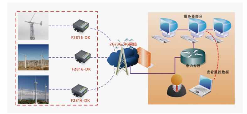 風(fēng)力發(fā)電系統(tǒng)通常安裝在風(fēng)沙漫步的極嚴苛環(huán)境中,對設(shè)備的未定型要求極高。四信智慧電力F2816-DK 嵌入式IP MODEM通過其面向風(fēng)電場設(shè)備提供多種類型的數(shù)據(jù)和信號接口,與風(fēng)機PLC、總線裝置進行通訊。實時監(jiān)測數(shù)據(jù)、更新PLC參數(shù),測風(fēng)塔氣象數(shù)據(jù)接入及通過備用數(shù)字I/O和模擬I/O輸出信號和接入信號,因此F2816-DK 嵌入式IP MODEM可部署整個風(fēng)力發(fā)電監(jiān)測系統(tǒng),并通過移動運營商網(wǎng)絡(luò)反饋至管理中心,實時接收監(jiān)控中心的數(shù)據(jù)傳輸指令和管理配置指令,完成遠程數(shù)據(jù)傳輸和監(jiān)控任務(wù)。