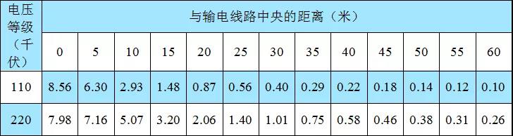 高壓線周邊工頻電場(chǎng)強(qiáng)度的大小主要取決于線路電壓的高低、線路導(dǎo)線的排列方式、截面積、導(dǎo)線對(duì)地高度和觀測(cè)點(diǎn)與導(dǎo)線的距離等。典型110千伏、220千伏輸電線路的工頻電場(chǎng)強(qiáng)度如下表所示。