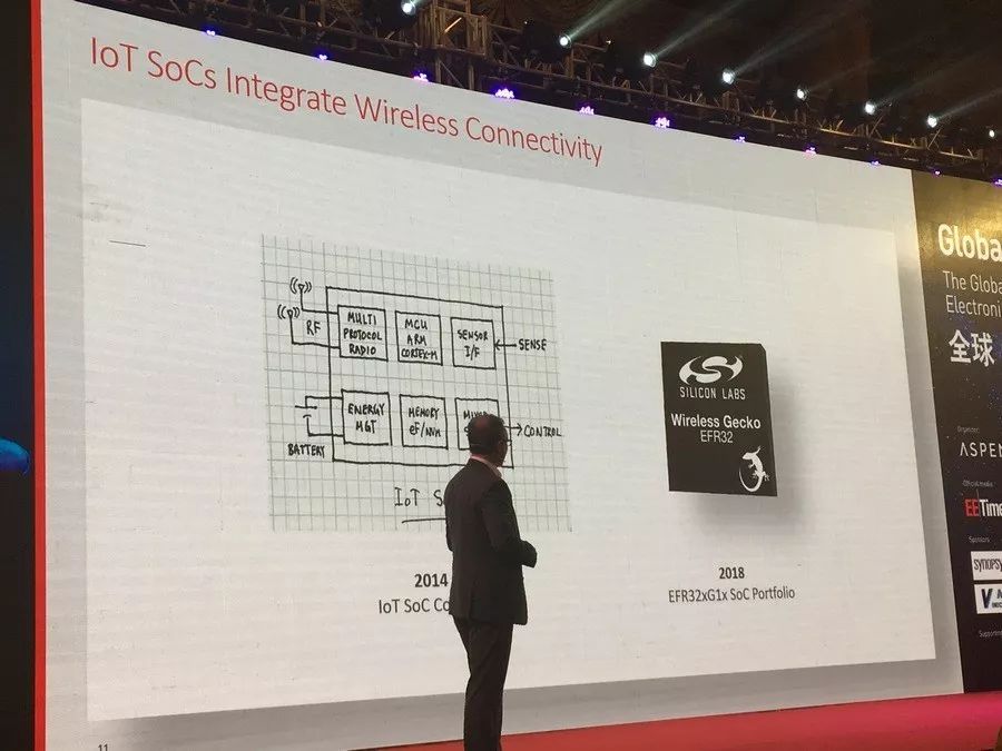 在智能手機(jī)中有很多芯片,包括RAM、FLASH、PMU、應(yīng)用處理器、藍(lán)牙、WiFi等,所有這些芯片都非常重要,但他們都是需要通過電池來驅(qū)動(dòng)的。“但在物聯(lián)網(wǎng)設(shè)備中,我們可以將無線連接集成進(jìn)SoC中,這樣的話連接會(huì)更加簡(jiǎn)單,也更加節(jié)能。”他表示。