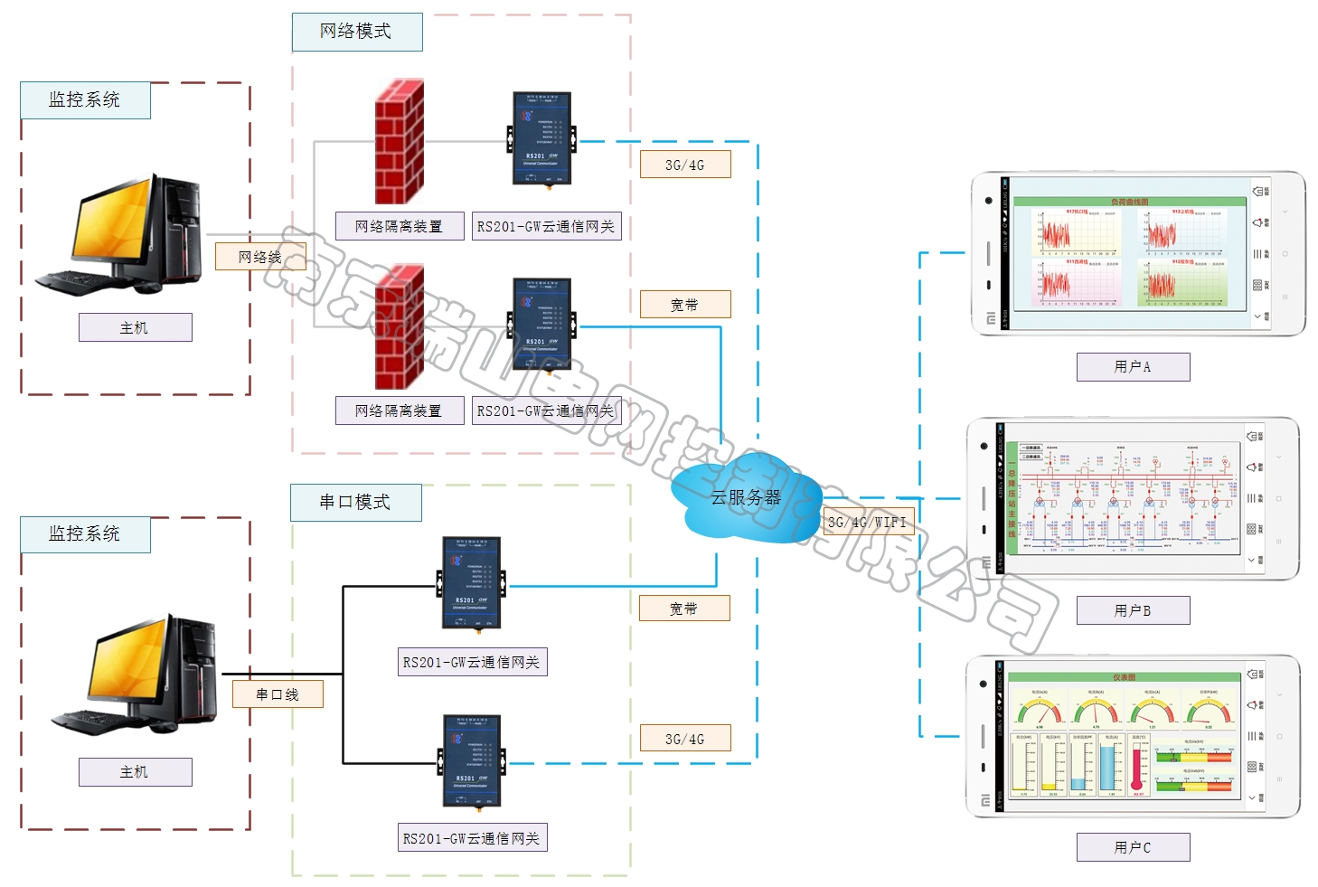 只需把正在運(yùn)行的監(jiān)控系統(tǒng)設(shè)置一路轉(zhuǎn)出通道(目前市面上所有監(jiān)控系統(tǒng)都有這個(gè)功能),把數(shù)據(jù)傳給我們的云通信網(wǎng)關(guān)RS201-GW,通過(guò)網(wǎng)絡(luò)隔離或者直接串口連接,確保對(duì)原有系統(tǒng)無(wú)任何影響,安全可靠。用戶直接下載我們的手機(jī)App軟件,注冊(cè)登錄用戶即可。