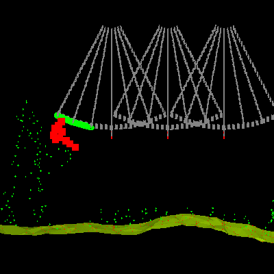 電力線走廊數(shù)字化重建后,即可得在電腦中直觀立體顯示電力線、電塔的位置、與走廊地物的空間關(guān)系;結(jié)合桿塔上安裝的溫度、濕度、風(fēng)速等監(jiān)控設(shè)備傳回的數(shù)據(jù),即可在三維數(shù)字化電網(wǎng)基礎(chǔ)上進(jìn)行各種電力作業(yè)分析,如預(yù)測(cè)與模擬不同溫度、風(fēng)速、覆冰下弧垂變化情況,模擬樹(shù)木生長(zhǎng)情況等。圖11中紅色點(diǎn)表示某些狀態(tài)下可能會(huì)對(duì)電力線安全構(gòu)成威脅的植被點(diǎn),圖12中藍(lán)色點(diǎn)表示樹(shù)木在生長(zhǎng)一段時(shí)間后可能會(huì)對(duì)電力線安全產(chǎn)生威脅的植被點(diǎn)(PLS-CADD)。