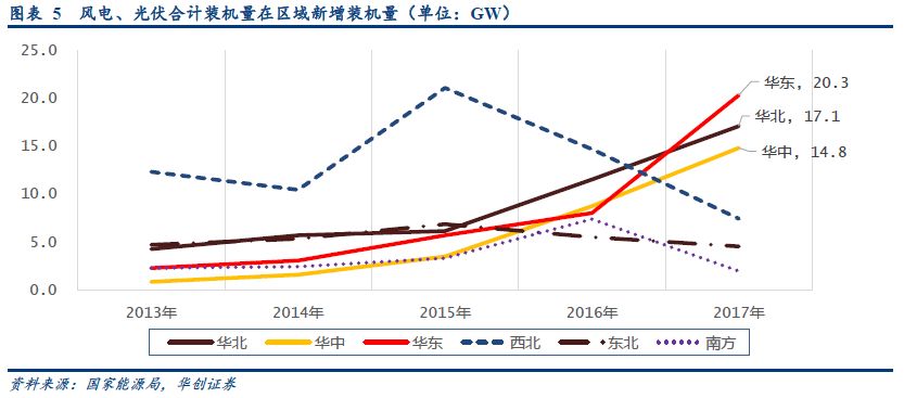 光伏撐起“第三級”臺階,向中東部地區(qū)轉(zhuǎn)移。2017年,風電裝機量連續(xù)第二年下滑,僅有15GW,不足2015年的一半,而光伏裝機量達到53GW。但值得注意的是,光伏裝機量中有接近40%為分布式光伏裝機,區(qū)域分布也大范圍向中東部地區(qū)轉(zhuǎn)移。從2015年開始,華中、華東區(qū)域,風電、光伏裝機量在全部新增裝機量中的占比開始迅速提升,從2015年的3.5GW、5.7GW迅速提高到2017年的14.8GW、20.3GW。華北地區(qū)在2017年新能源裝機量在總新增裝機量也一躍提升到了17.1GW,同比增長48%。