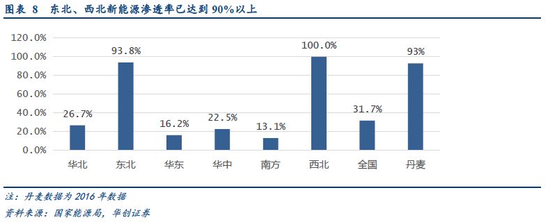 2017年底,東北、西北地區(qū)的新能源發(fā)電裝機量分別達到55GW、81GW。而2017年內(nèi),東北、西北地區(qū)最高用電負荷分別為59GW、81GW,新能源發(fā)電滲透率(新能源裝機量/最高電網(wǎng)負荷)分別達到94%、100%。2016年,丹麥、西班牙、葡萄牙的這一指標分別為93%、78%、63%。按照2017年底的裝機量和年內(nèi)最大負荷情況看,東北、西北地區(qū)的新能源滲透率已經(jīng)達到與丹麥幾乎相同的水平。