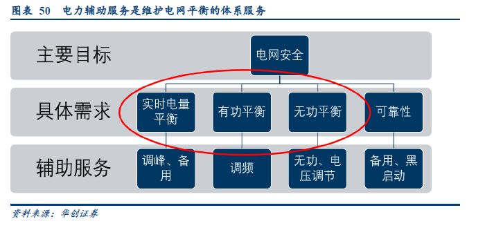 電網(wǎng)的功率平衡問題是電網(wǎng)安全的核心,也是輔助服務(wù)的主要工作內(nèi)容。具體來看,電力輔助服務(wù)解決了系統(tǒng)的四方面需求:1、實時電量平衡;2、有功功率平衡;3、無功功率平衡;4、電網(wǎng)可靠性。其中,前三項是保證電網(wǎng)平衡的具體需求,依靠電力輔助服務(wù)中的調(diào)峰、調(diào)頻、調(diào)壓、無功補償?shù)确绞浇鉀Q的,這一需求占據(jù)了輔助服務(wù)90%以上的日常工作。此外,電網(wǎng)安全還包括可靠性、故障恢復的需求,這些由輔助服務(wù)中的備用、黑啟動等項目保證。